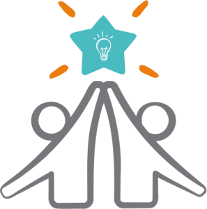 Zwei ineinandergreifende orange Vierecke, dynamisch nach oben gerichtet und auf einen dunkelgrauen Würfel gestützt